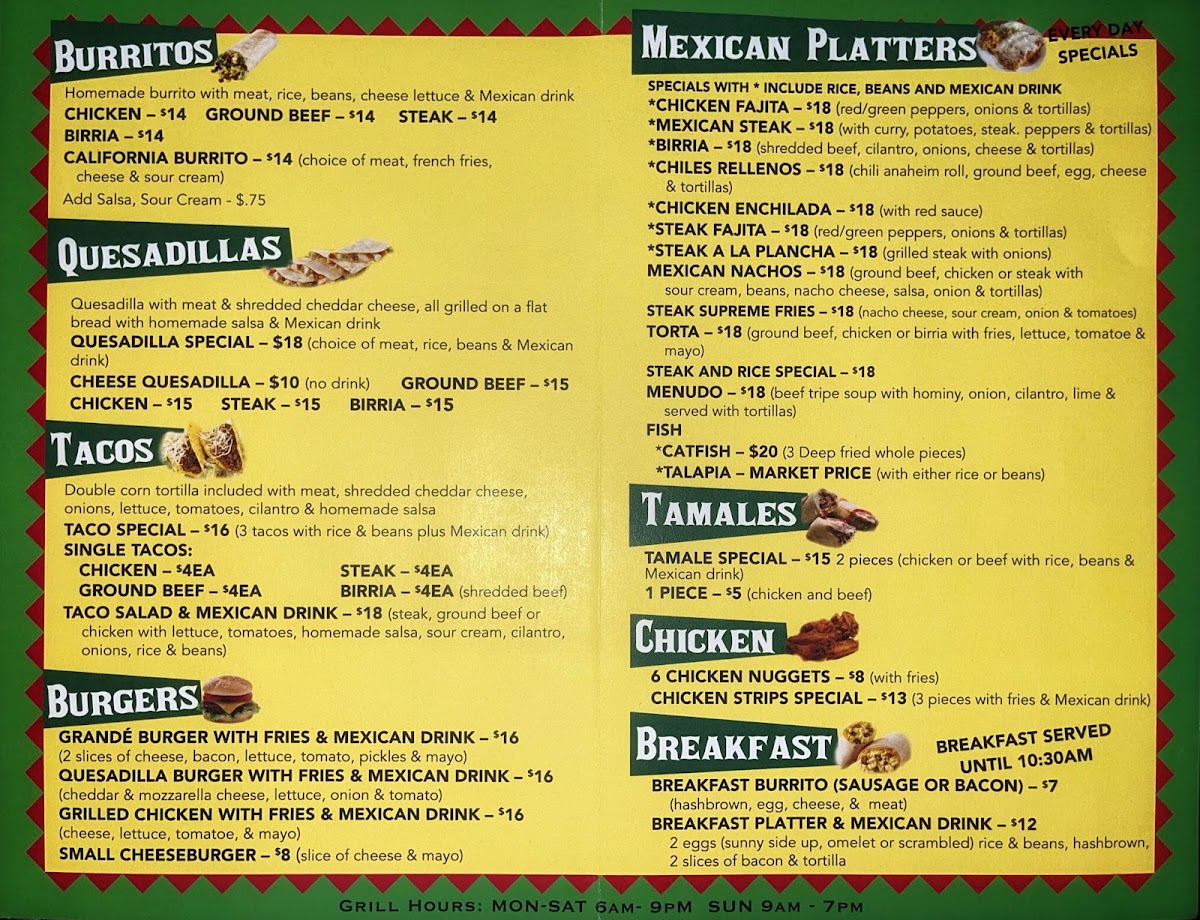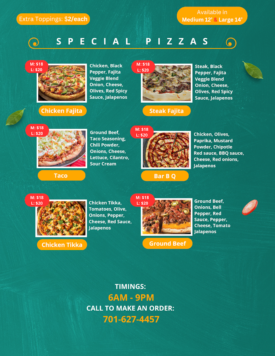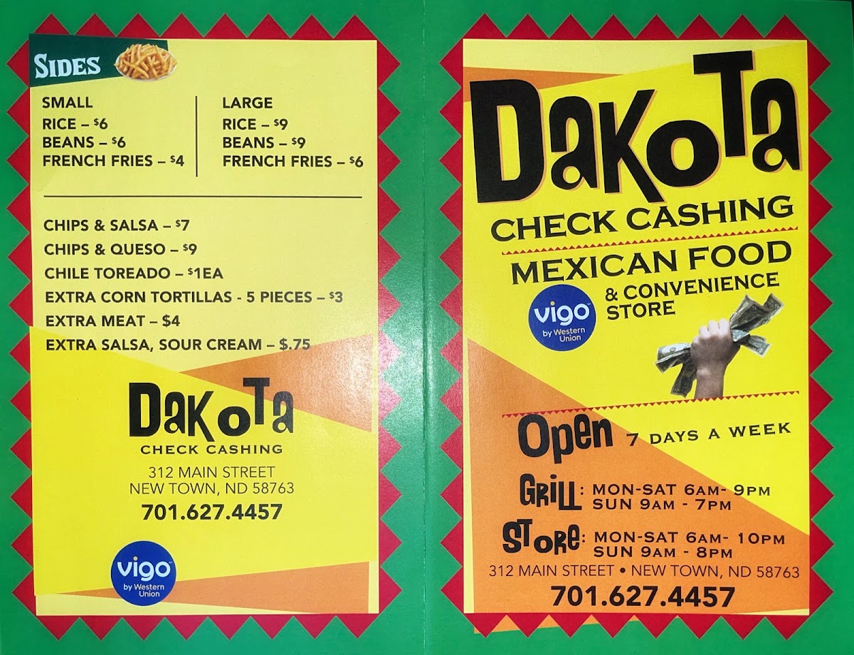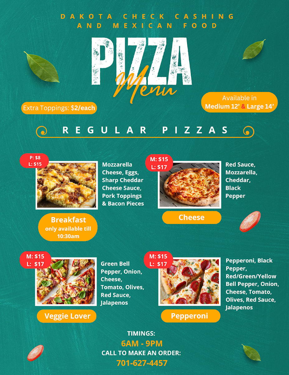 Dakota Check Cashing & Service offers a diverse and flavorful menu that combines classic comfort food with bold Mexican-inspired dishes. For sides, you can enjoy French Fries. Their taco options include the Taco Special, a perfect choice for taco lovers. Burger enthusiasts will appreciate the hearty Grandé Burger with Fries & Mexican Drink, the flavorful Quesadilla Burger with Fries & Mexican Drink, and the grilled option of Grilled Chicken with Fries & Mexican Drink. For smaller appetites, the Small Cheeseburger offers a satisfying meal. The Mexican platters are also a highlight, featuring Mexican Nachos, Steak Supreme Fries, the classic Torta, and the delicious Steak and Rice Special. A comforting option is the Menudo. Tamale fans can indulge in the Tamale Special, while chicken lovers can opt for 6 Chicken Nuggets or the savory Chicken Strips Special. The pizza selection is equally enticing, with regular options like Cheese, Breakfast, Veggie Lover, and Pepperoni, along with special pizzas such as Chicken Fajita, Taco, Chicken Tikka, and Steak Fajita. For other flavorful choices, try the Chicken, Birria, or the filling California Burrito and the delicious Quesadilla Special or Cheese Quesadilla. Each dish offers a unique taste, ensuring a satisfying meal for any preference.